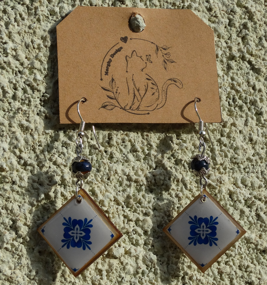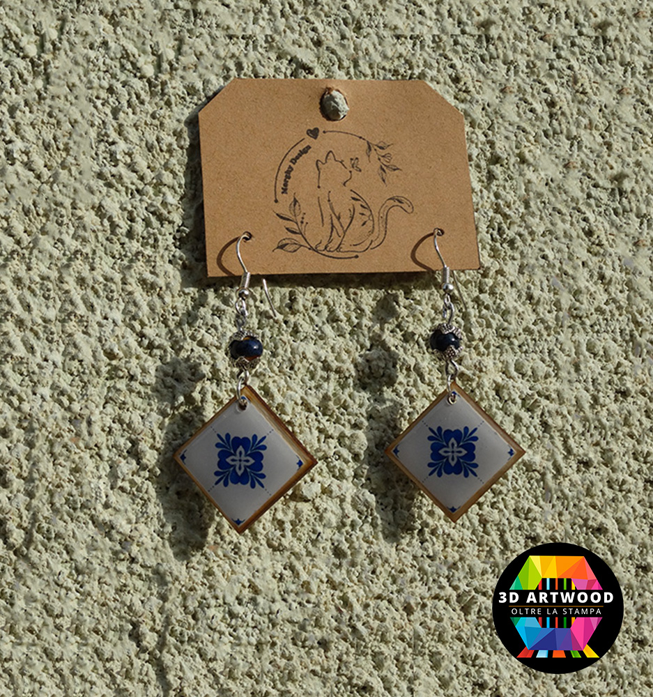 Raffinati orecchini pendenti con base in legno che evocano l'arte della maiolica con dettagli finemente decorati. La fusione tra il calore naturale del legno e i vivaci motivi floreali o geometrici crea un contrasto suggestivo. Un connubio di tradizione e modernità, perfetto per aggiungere un tocco di fascino artistico al tuo outfit.