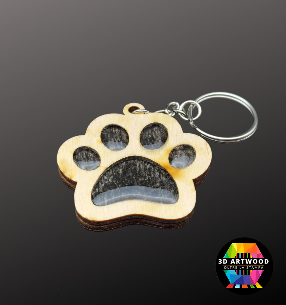 Questo portachiavi è caratterizzato da un incantevole design a forma di zampa, realizzato con un connubio di legno e resina.
