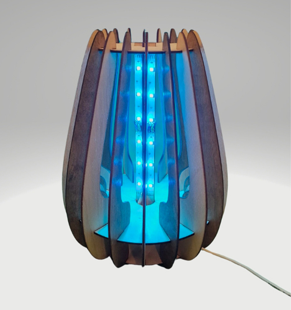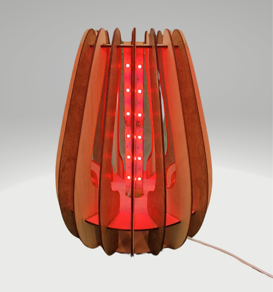 Il design è moderno e organico, con pannelli in legno curvi e intagliati che formano una struttura elegante attorno alla fonte di luce centrale.