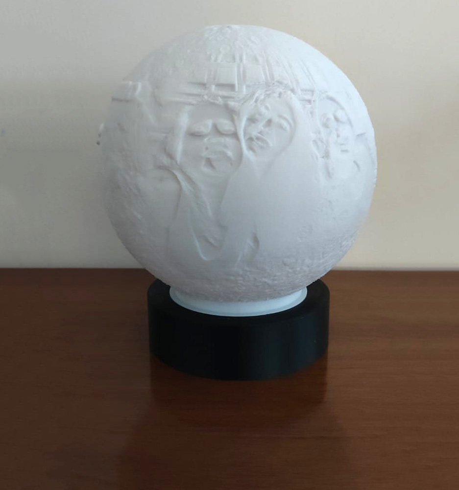 La base su cui poggia la sfera è altrettanto importante. Realizzata anch'essa con la stampante 3D, offre una piattaforma stabile e sicura per l'esposizione della litofania. All'interno della base può essere presente una batteria ricaricabile (opzione), utilizzando un semplice cavetto Type-C. Questo permette di utilizzare la litofania senza doverla collegare continuamente a una fonte di alimentazione esterna.
