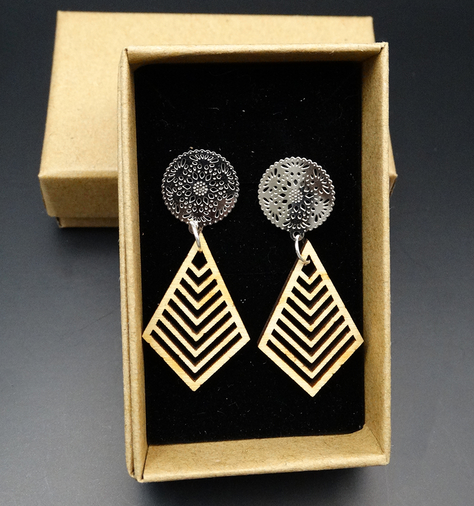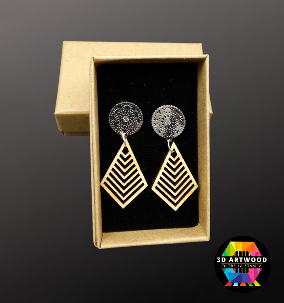 Eleganti orecchini pendenti, con perno a bottone con forme geometriche, realizzati con precisione grazie al taglio laser per dettagli impeccabili.